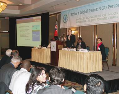 The Interactive Plenary Session concentrated on the theme NGOs and Human Security: Ethical Dilemmas. The concept of human security represents a new paradigm in understanding the complex of interrelated threats impacting the individual. Historically, security paradigms have focused on the state and its ability to defend itself from external threats. In the human security conception, the individual is the primary referent of security. This people-centered approach broadens the focus from security of borders to the protection of individuals inside and across those borders. Chaired by Dr. Aurora Martin, President of the Euro-Atlantic Partnership for Sustainable Development, three presenters began the session with short remarks designed to stimulate discourse. These speakers were Gina Ross, Founder and President of International Trauma Healing Institute, Duff Conacher, Coordinator of Democracy Watch, and Zoe Nielson, Deputy Director of the Human Security Report Project. These short presentations provided plenty of inspiring information. For example, Ms. Nielson provided detailed, graphical data that showed, contrary to popular views that the climate regarding conflicts actually has been changing in positive ways since 1992, with reduction in the number of conflicts and deaths from conflicts. While some areas, such as the Congo and Rwanda, have seen millions of deaths, overall the picture of inter- and intra-state conflicts has been ones of positive trends, with some of this success attributable to the work of NGOs.